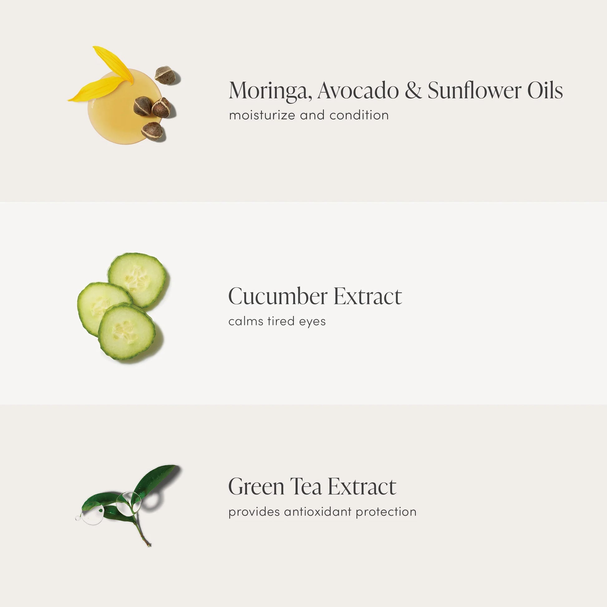 An eye conditioner and concealer containing moringa butter and avocado oil, both high in vitamins A, C, D and E. Contains green tea extract, a potent antioxidant.